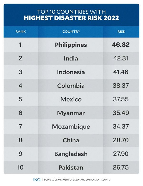 The World Risk Index 2022 identified the Philippines as the most disaster-prone country in the world due to its high risk, exposure, and vulnerability to disasters and calamities. This annual risk report calculates the disaster risk for 193 countries worldwide (representing 99% of the global population).